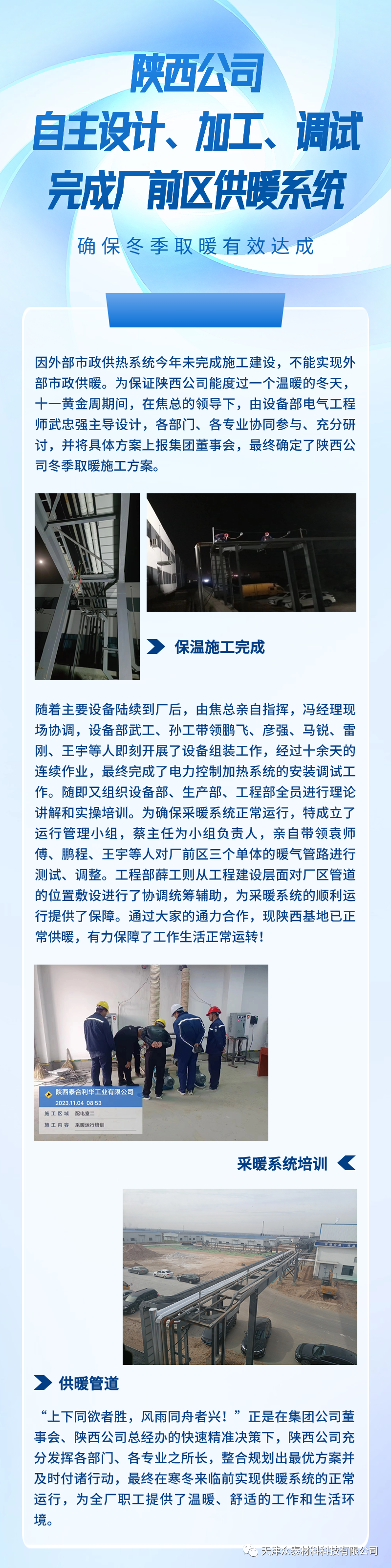 为保证陕西公司能度过一个温暖冬天,十一黄金周期间,在陕西公司焦总的带领下,由设备部电气工程师武忠强主导设计,各部门、各专业协同参与、充分研讨,最终确定了陕西公司冬季取暖施工方案。通过大家通力合作,现陕西基地已正常供暖,有力保障了工作生活正常运转!